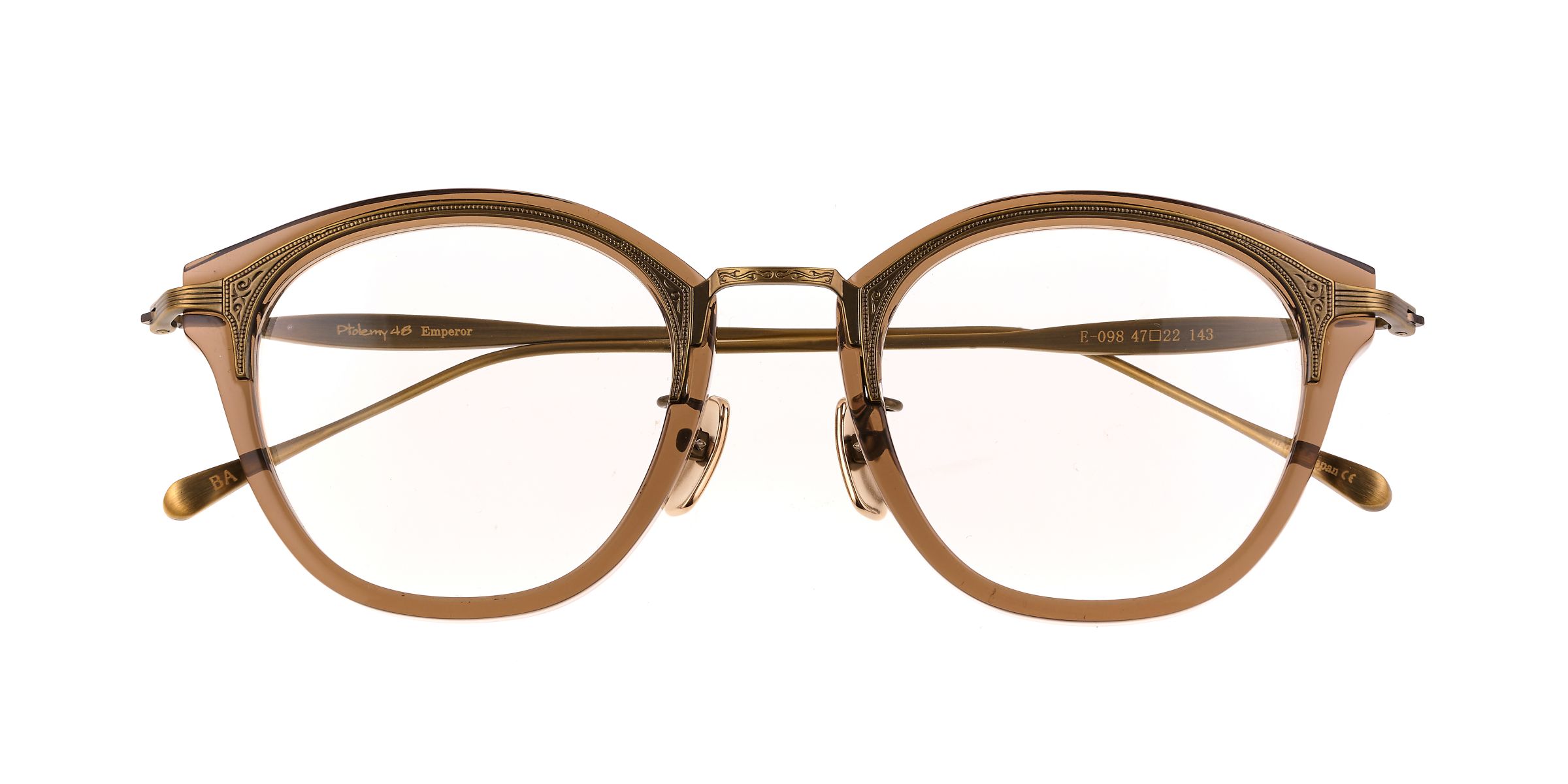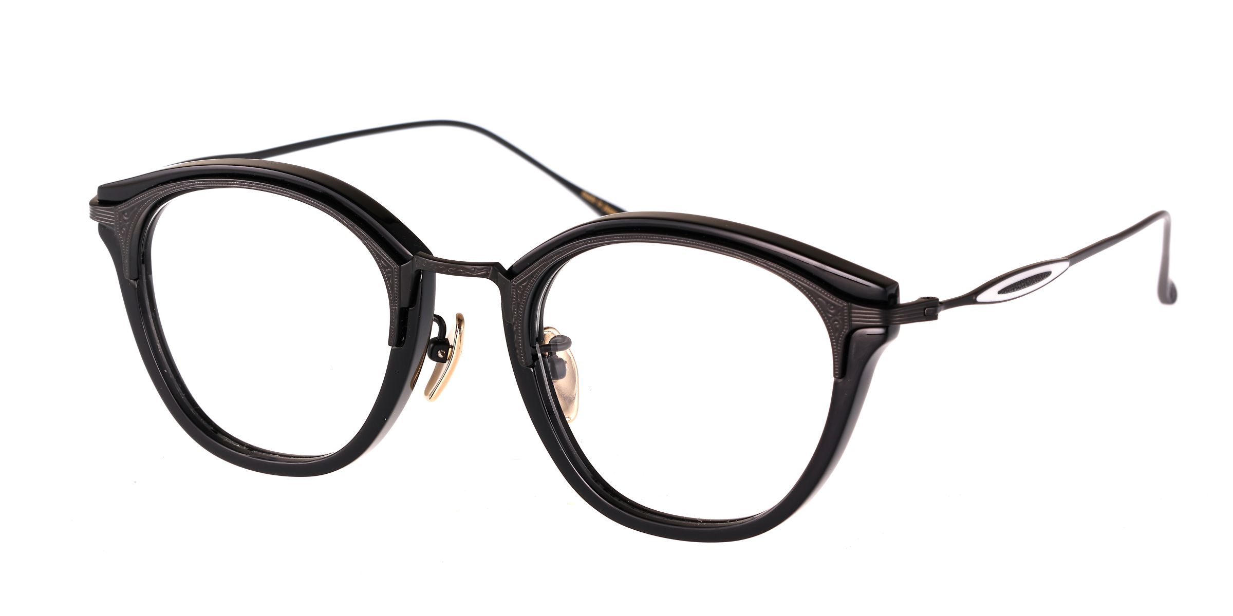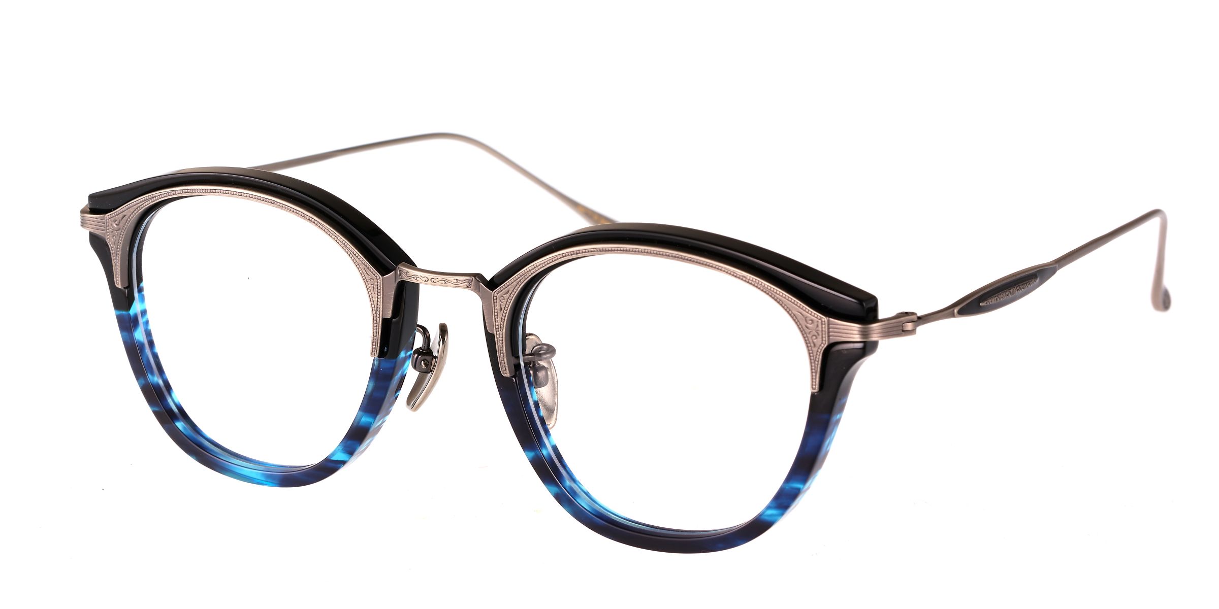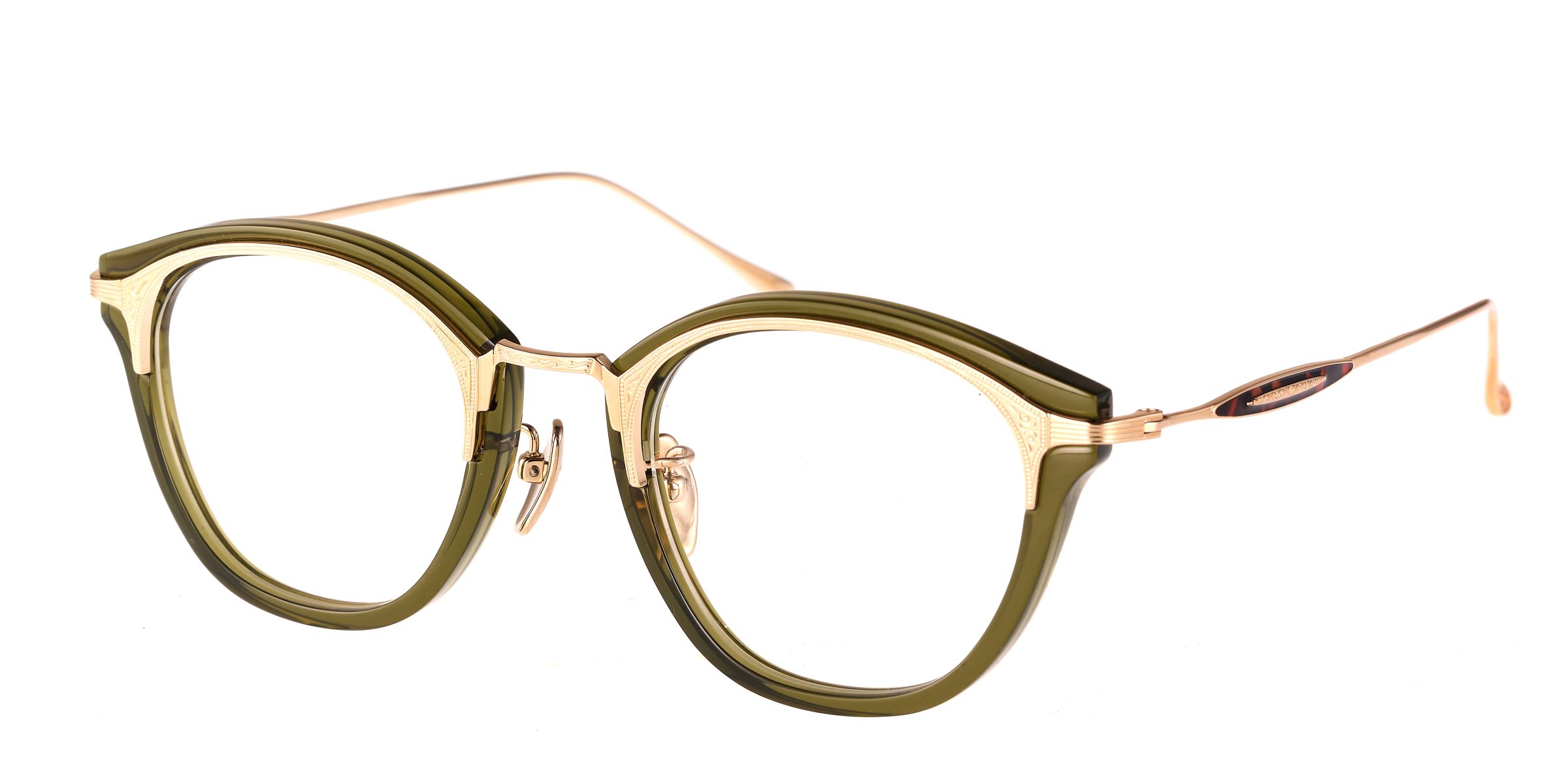 フロントパーツは通常、ブロウとブリッジ、鎧部分をロウ付けで組み合わせますが、その常識を覆す高度な金型製造で、繊細なアラベスク模様を施したロウ付け無しの一体プレスパーツで作り出しました。ロー付け無しの一体プレスパーツによって完璧な光学的要素得るためのフレームになりました。アラベスク模様が見えるようにアセテートは2 層の生地を採用。そこから見えるメタルパーツや模様がみせる圧倒的なディテールの密度とリムの細さは圧巻です。シンプルに見えるよう、様々な部分にデザインが介入し自然な状態でフィニッシュしました。シェイプはクラウンパント、スマートでありながら、どこか飄々とした存在感が魅力!