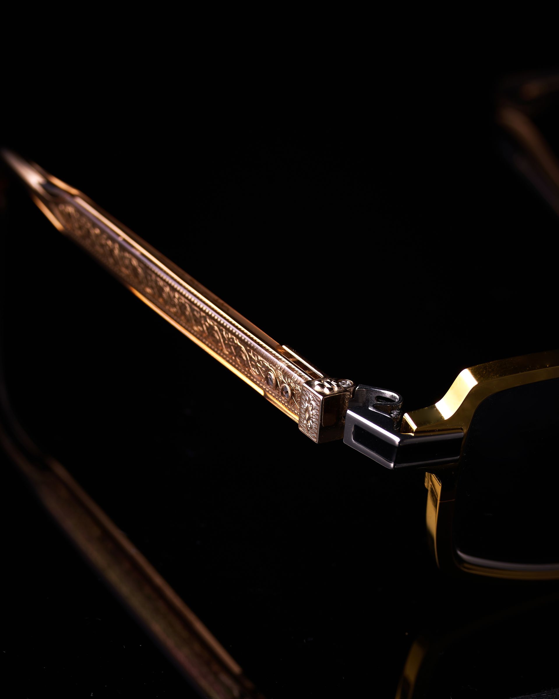 フロント一体型のスクエアーシェープ枠を、ボリュームある6mmシートチタンで作成。通常プラスチック製内ワッパが使用される箇所をメタルインナー素材に置き換え、さりげないフロントに艶やかな輝きを表情を与えました。アンティークメッキグラデーションカラーとの組み合わせはまさにトレミー48ならではのカラーリングです。テンプルは細身に設計され、新オニキスヨロイは細身に作り上げました。三連蝶番によるしなやかなテンプルは心地よい装用感を実現します。さらにテンプルの芯金は和彫り彫金の代表作である「地彫り彫金」を用いた芯金を採用。ヨロイから流れるように見える地彫り彫金「ロココ模様」は高級感を引き立てます。