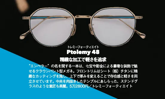 エンペラーの名を関する一本は、七宝や彫金による豪奢な装飾で魅せるクラウンパント型眼鏡。中央を肉抜きしたテンプルにあしらったステンドグラスのような意匠も美麗。